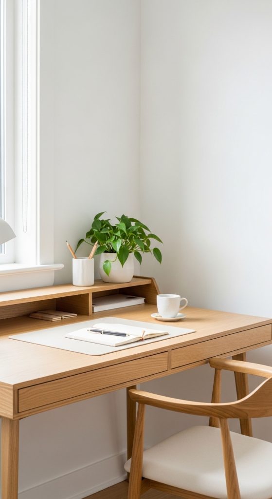 Scandinavian design focuses on simplicity and warmth. A light wooden desk paired with white walls creates a balanced and cozy workspace.