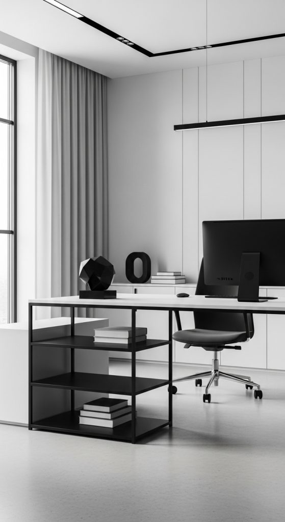 A black and white minimalist office creates a strong visual identity. A white desk with black shelving or accessories adds structure and sophistication.
