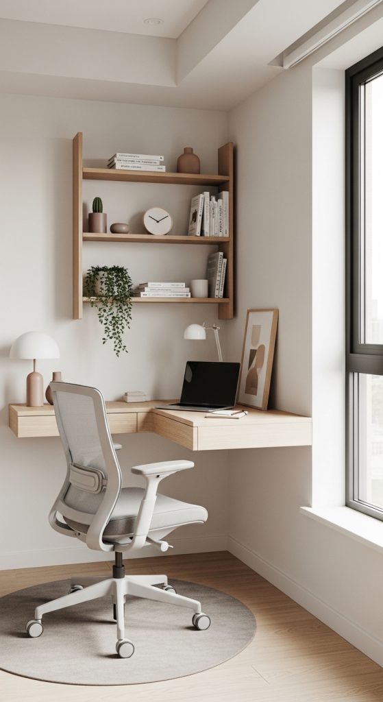 For small homes, a corner office setup is perfect. A floating desk mounted on the wall saves space while maintaining functionality.