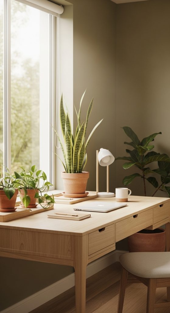 A nature-inspired office brings calmness into your workspace. Use wooden furniture, green plants, and soft earth tones.