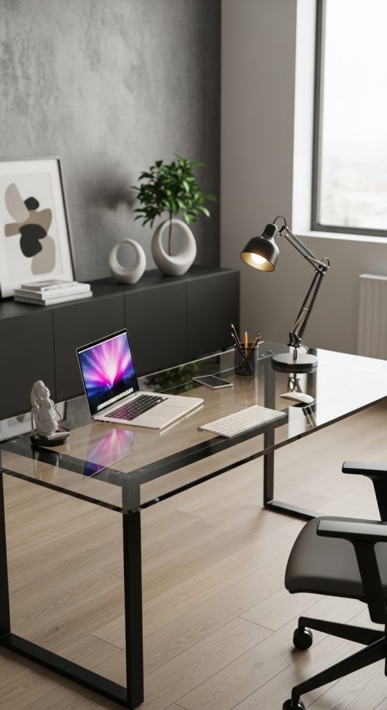 Keep accessories minimal, such as a laptop, lamp, and small organizer. This design works best in contemporary interiors.