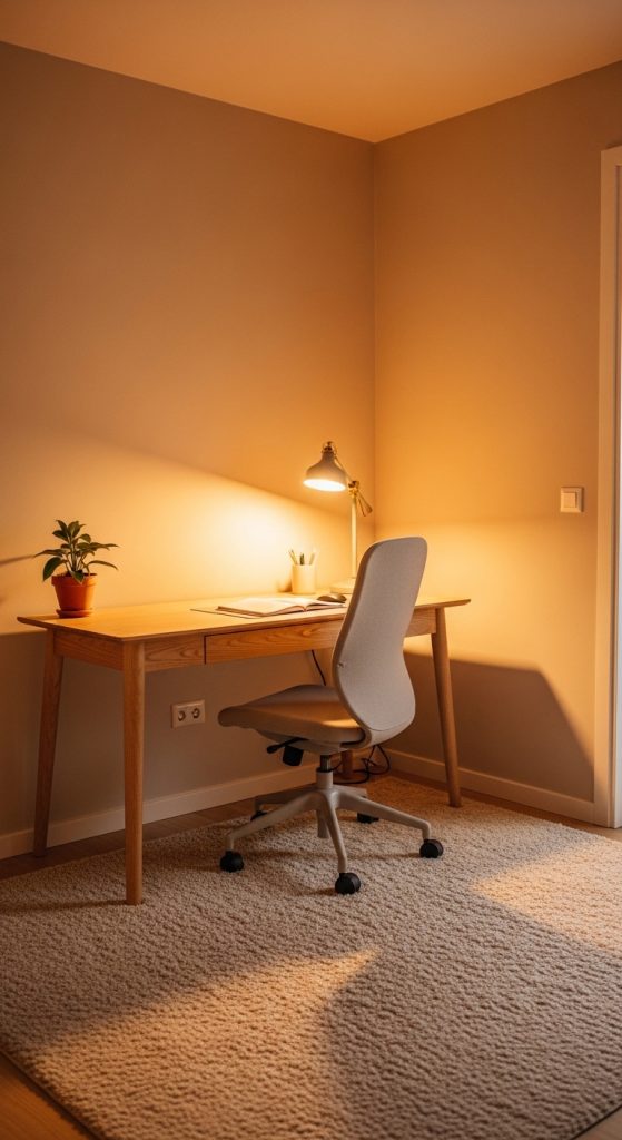 This setup blends minimalism with comfort. Soft lighting, warm tones, and a simple desk create a relaxed study environment.