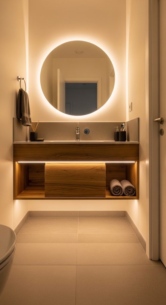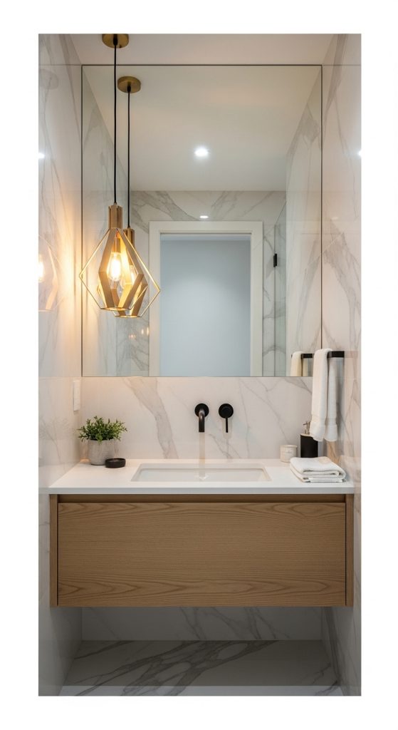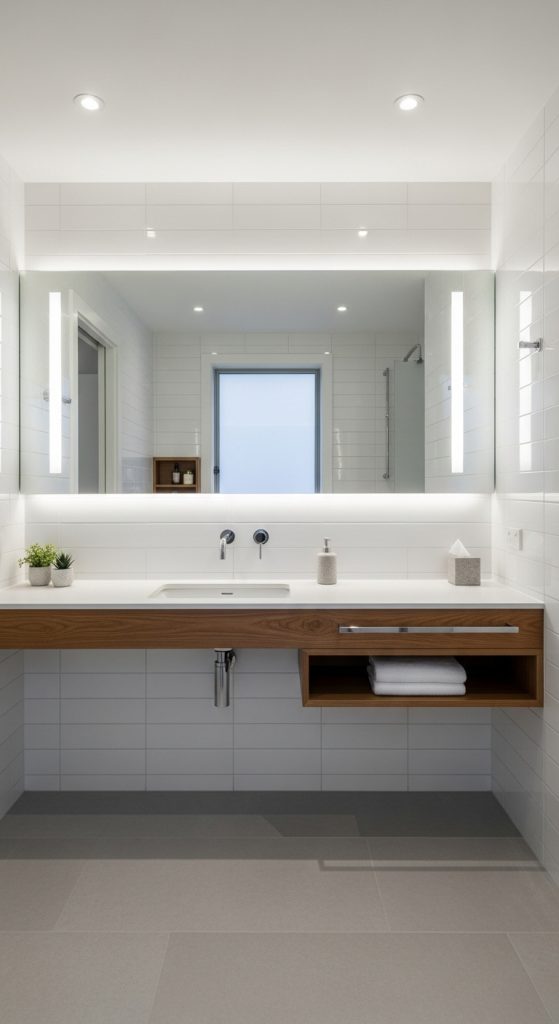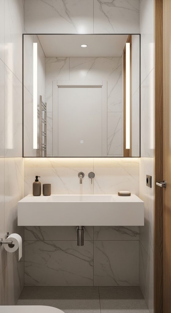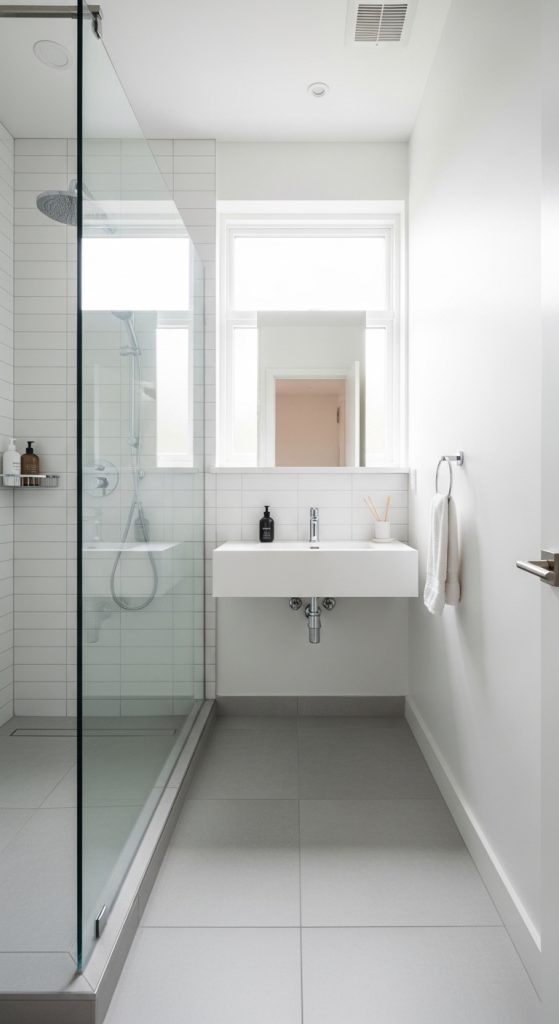 Another useful trick is incorporating reflective surfaces. Mirrors, glossy tiles, and glass shower panels can bounce light around the room, making the bathroom appear larger than it actually is. Large mirrors are especially effective in narrow spaces because they visually expand the room.