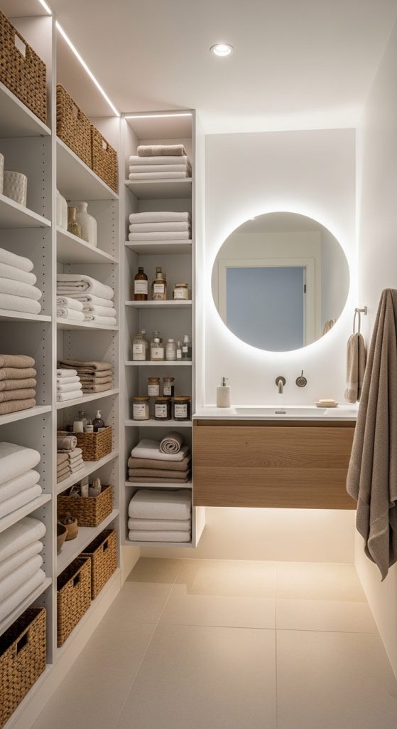Vertical storage solutions are particularly useful in narrow bathrooms. Since floor space is limited, using wall space for storage can help keep the room organized without cluttering the layout. Floating shelves, tall cabinets, and wall-mounted baskets allow you to store essentials while maintaining a clean and spacious appearance.