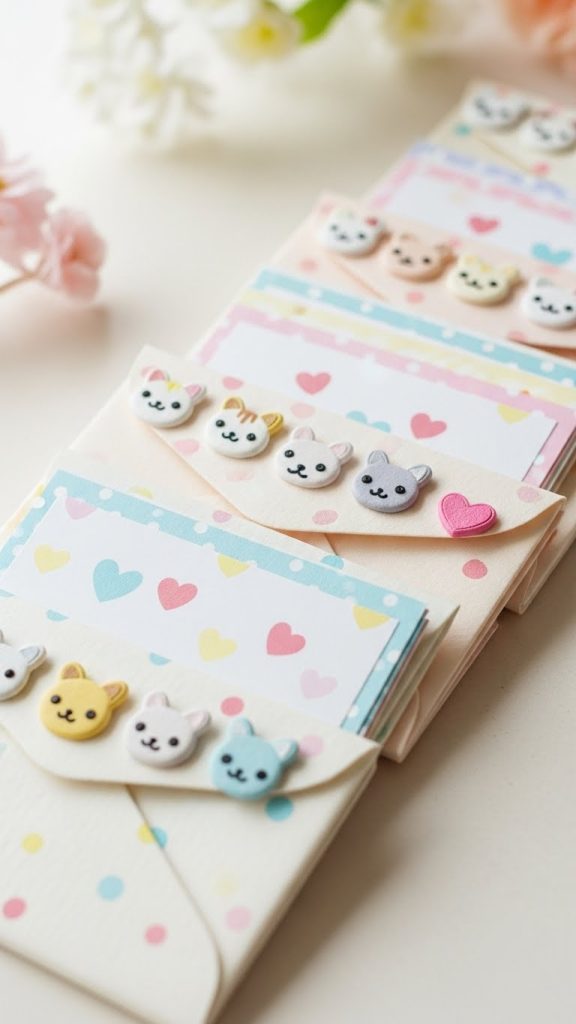 Handmade kawaii envelopes make sending letters or small gifts extra special. You can fold your own envelopes and decorate them with cute faces, tiny animals, or pastel patterns.