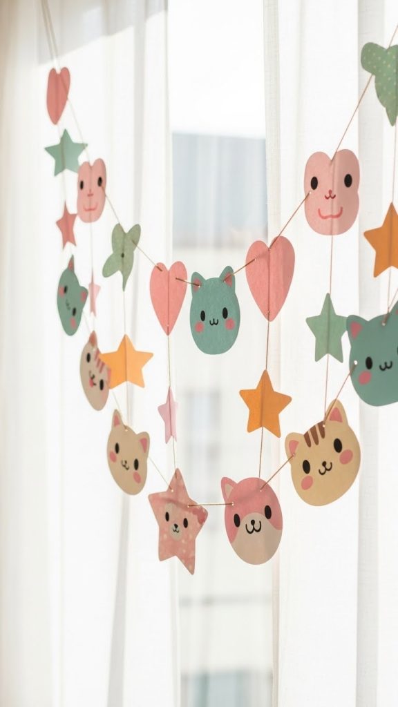 Garlands are a wonderful way to brighten up a room, and kawaii paper garlands make it extra playful. You can cut shapes like hearts, stars, or animal faces and string them together.