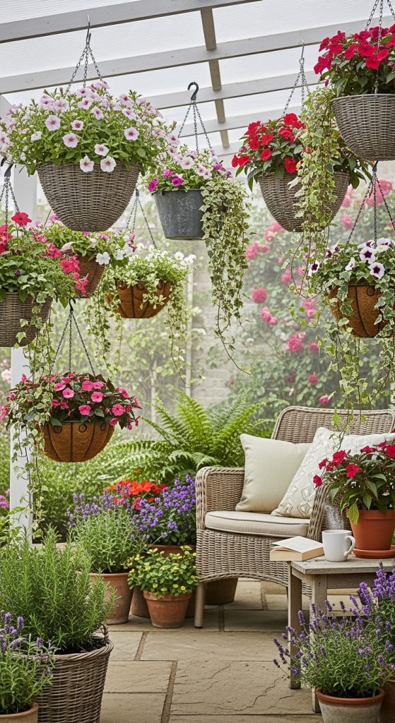 Hanging baskets add dimension and make your patio feel lush and vibrant.