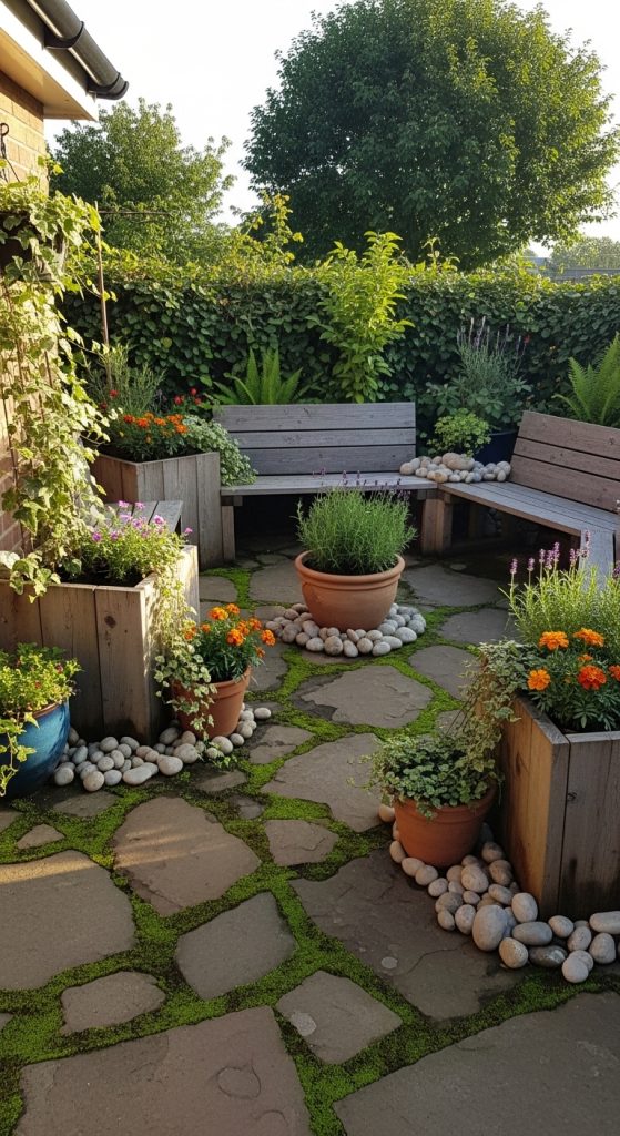 A rustic patio garden uses natural wood and earthy elements for a cozy feel.