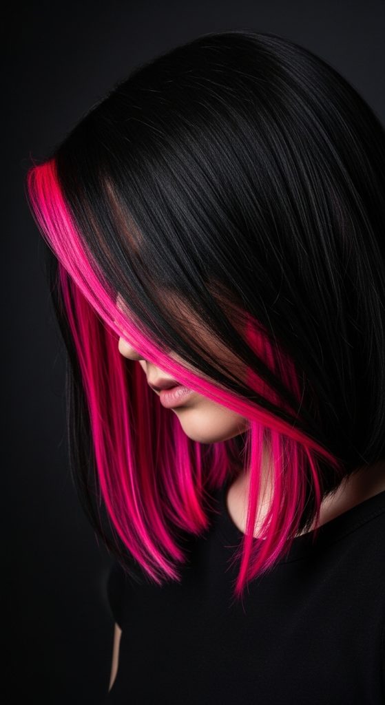 Neon pink peekaboo hair is vibrant and eye-catching. This look is best for creative personalities who love bold contrast and dramatic reveals.