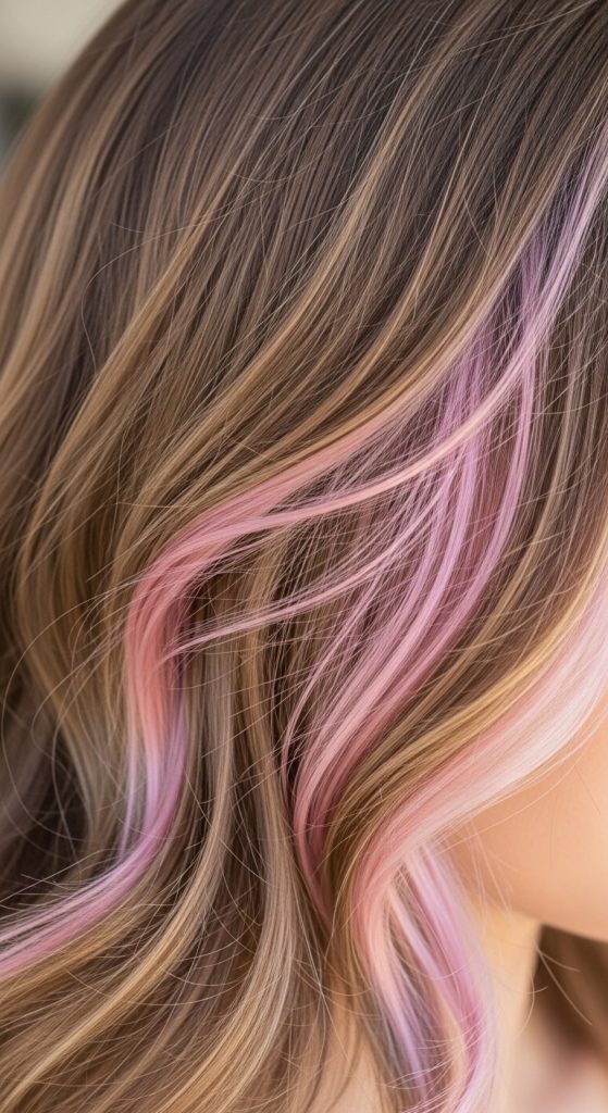 Baby pink peekaboo highlights involve thin sections of pink hidden beneath the hair. This creates a subtle, multi-dimensional effect.
