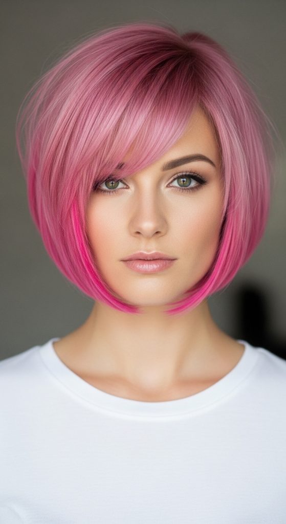 A bob haircut paired with pink peekaboo color feels modern and edgy. The shorter length makes the color pop when hair moves.