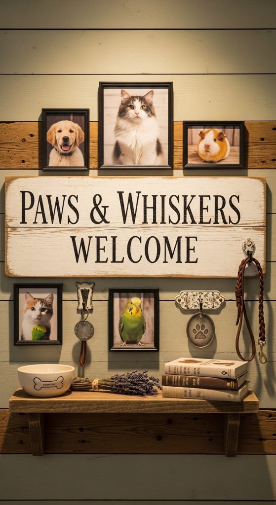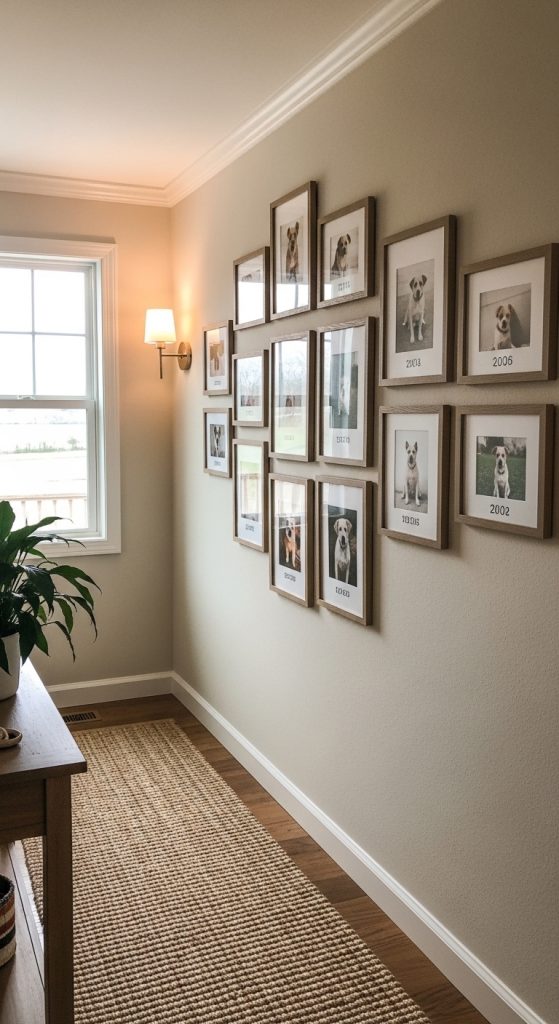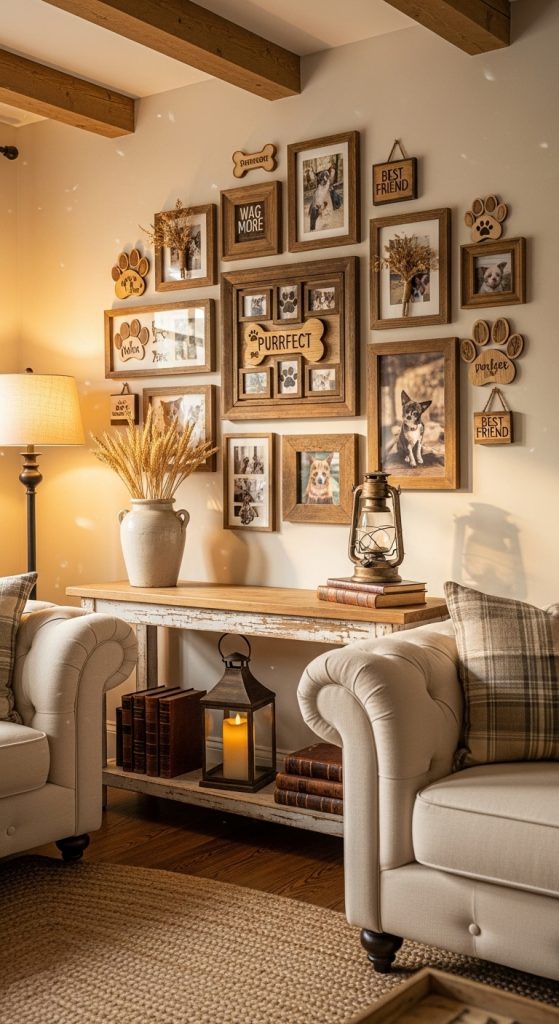 This style works beautifully in living rooms or entryways, giving guests an immediate sense of warmth and personality. It’s one of the most popular farmhouse pet gallery wall ideas on Pinterest.