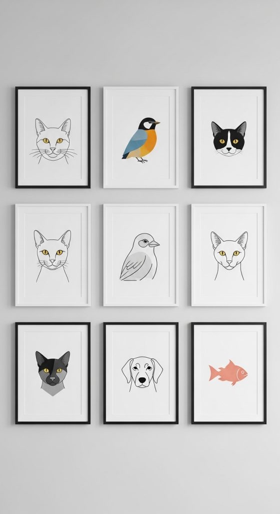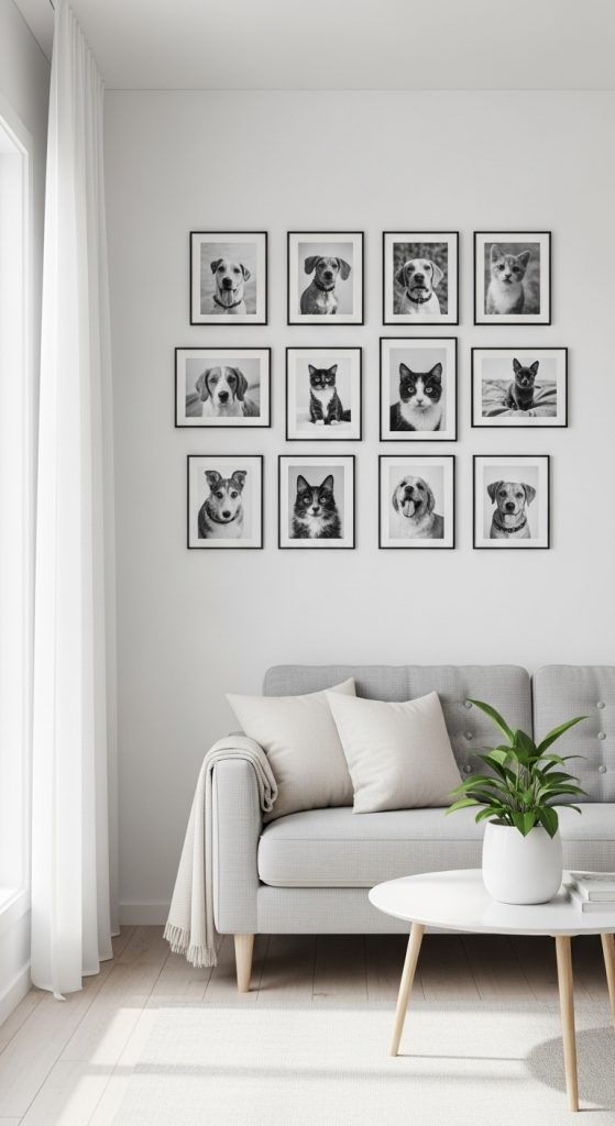 A minimalist pet gallery wall focuses on simplicity and elegance. This style is perfect for modern homes where clean lines and neutral tones dominate the decor. The idea is to keep everything subtle yet meaningful.