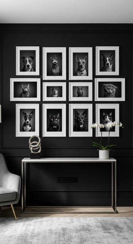A black and white pet gallery wall offers a timeless and artistic look. Converting your pet photos to grayscale creates a cohesive and elegant aesthetic.
