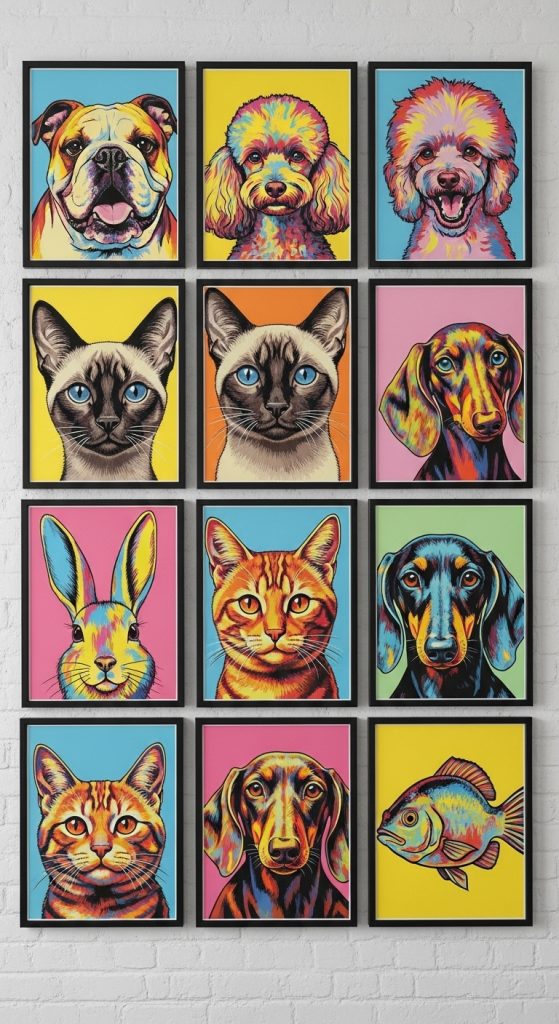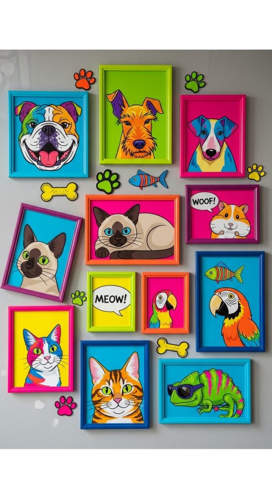For a fun and vibrant look, try a pop art pet gallery wall. This idea is inspired by bold colors and playful designs.