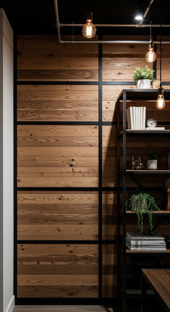 Wood panel wall combined with black metal trim or exposed brackets.