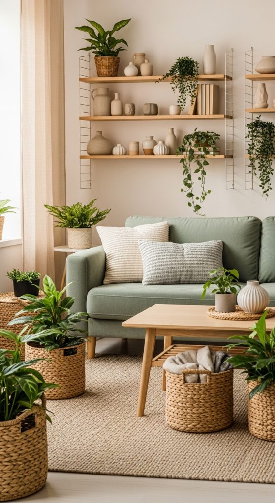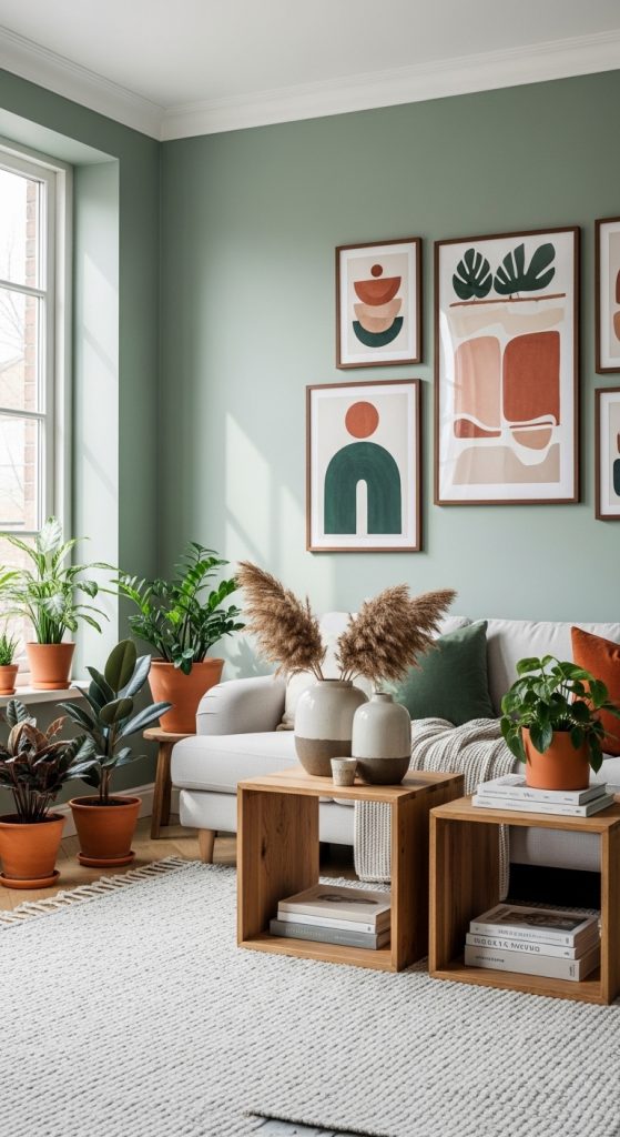 Plants are another element that complements this color palette perfectly. Because sage green is already inspired by nature, adding indoor plants enhances the natural aesthetic of the room. Wooden shelves, woven baskets, and ceramic pots can further emphasize the earthy and organic theme.
