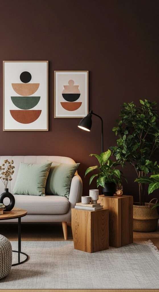 A brown accent wall can add depth while sage decor keeps the room balanced and calming.
