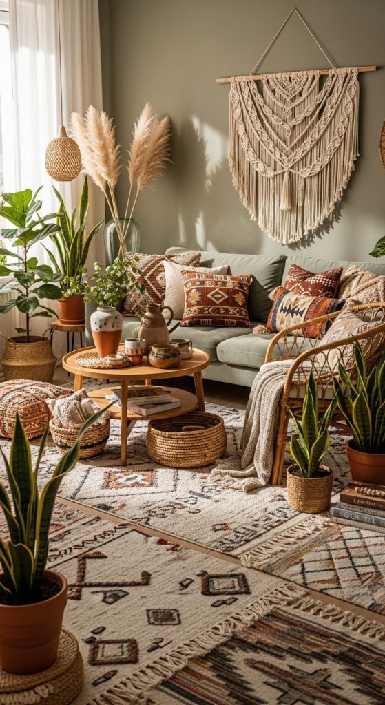 This style combines sage and brown tones with bohemian textures and natural materials.