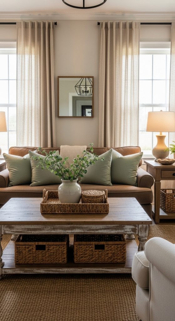 - Add a wooden farmhouse coffee table.