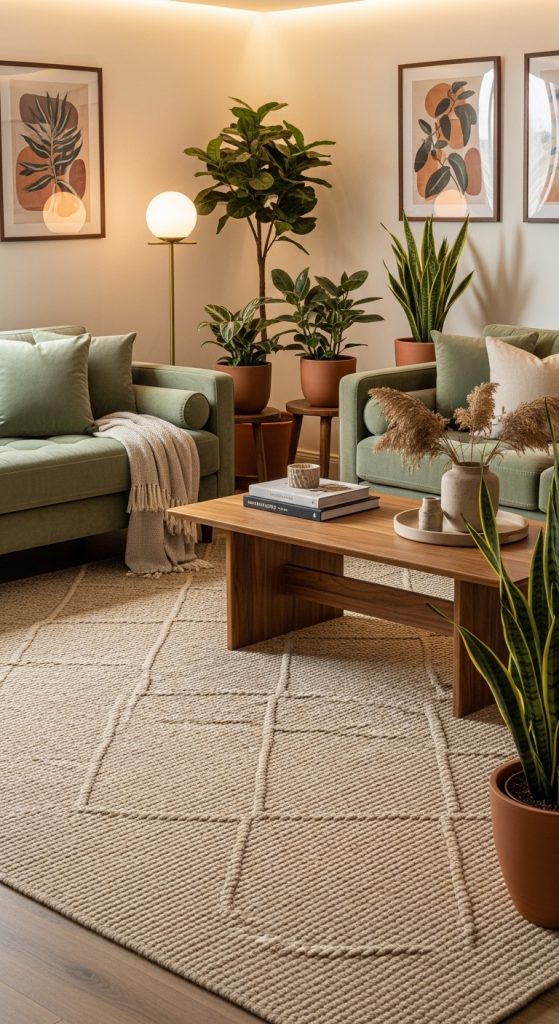 Lighting also plays an important role in bringing sage green and brown interiors to life. Warm lighting enhances the richness of brown tones while making sage green appear soft and soothing. Floor lamps, pendant lights, and table lamps with warm bulbs can create a cozy ambiance that makes the living room feel inviting during both day and night.