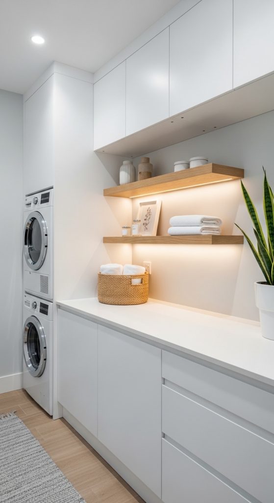 Pinterest Style: White cabinets, stacked washer-dryer, floating shelves, soft LED lighting, minimal aesthetic.