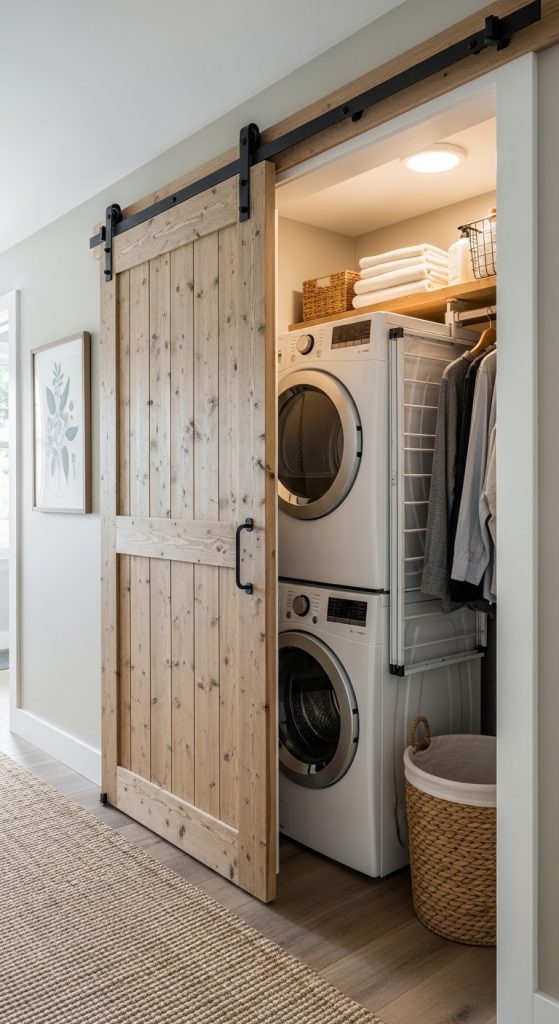 A concealed laundry area hidden behind sliding or folding doors for a clean home look.