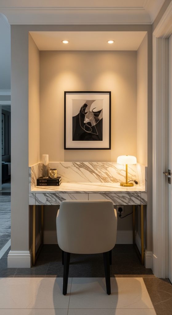 A marble or wood desk with gold accents can turn a hallway into a premium workspace.