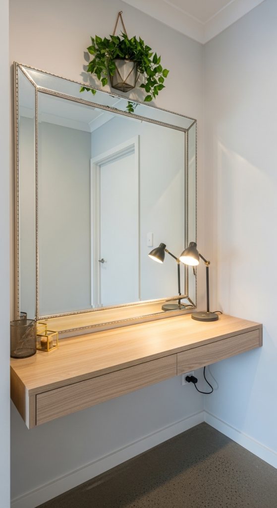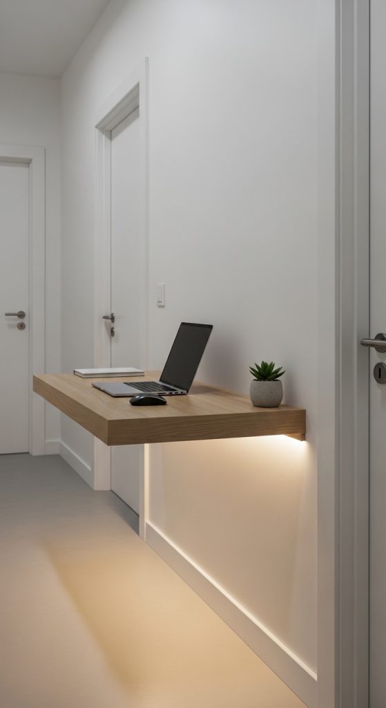 A floating wall desk is one of the best solutions for hallway spaces. It takes up no floor space and creates a clean, modern look.
