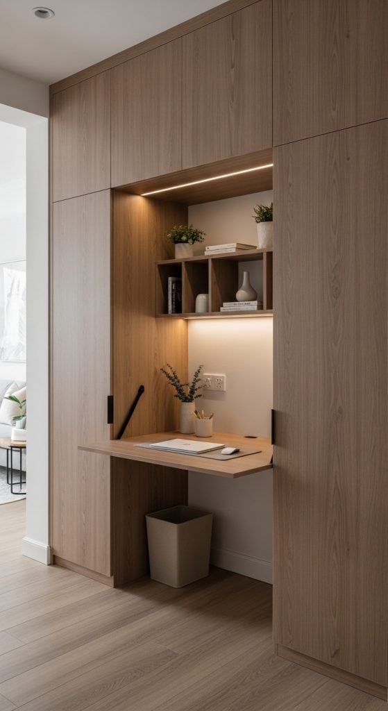A built-in cabinet study nook integrates seamlessly into hallway walls. When closed, it blends with the wall; when open, it becomes a functional workspace.
