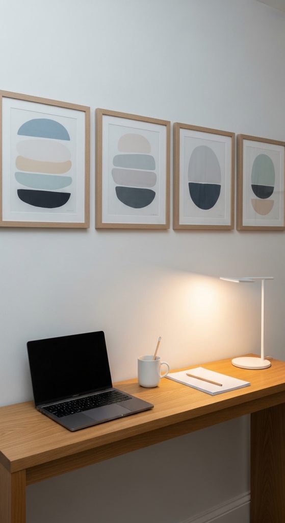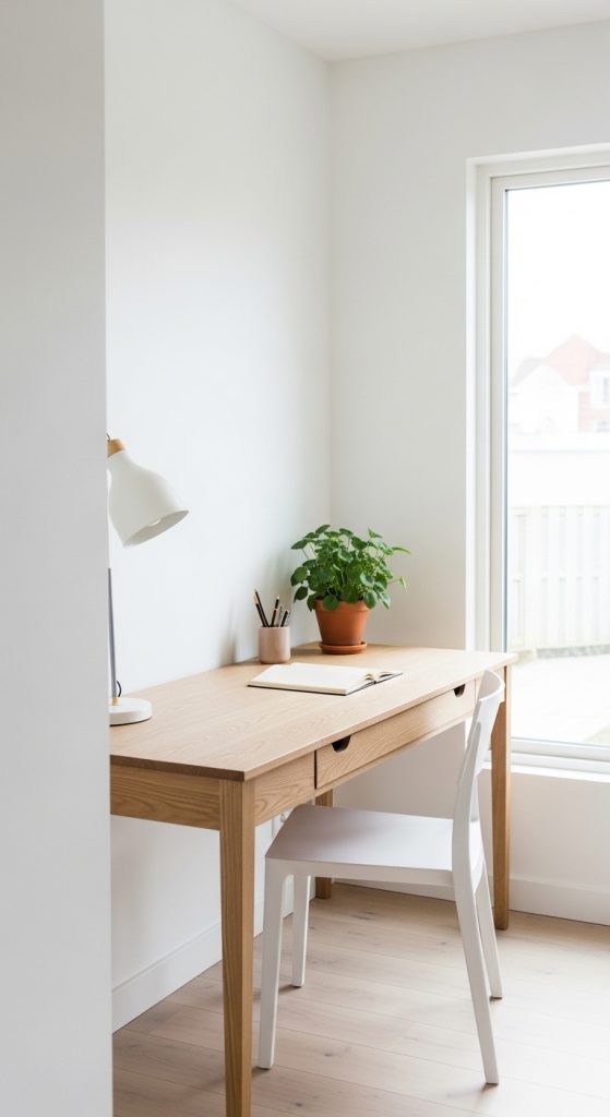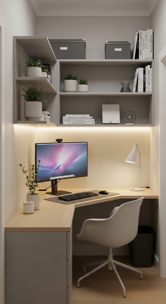 Storage should be vertical rather than horizontal. Use wall shelves, pegboards, or tall slim cabinets to store books, stationery, and office essentials.
