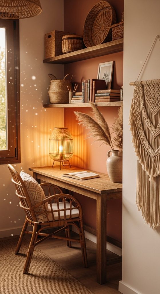 The “boho hallway study nook” includes warm earthy tones, woven textures, and small plants to create a cozy and artistic vibe.