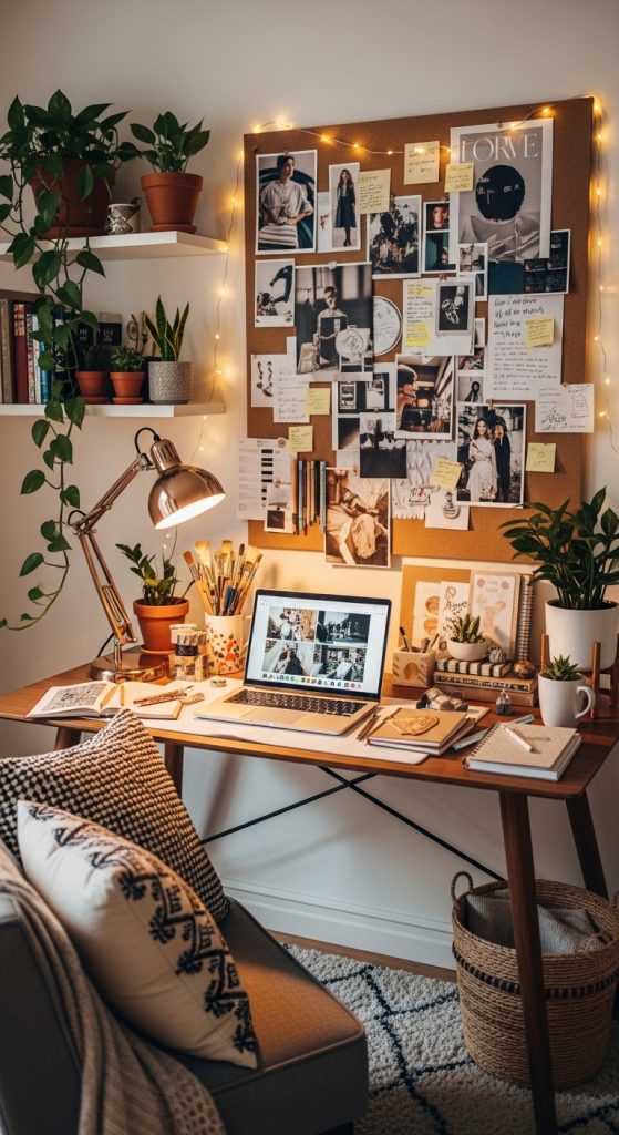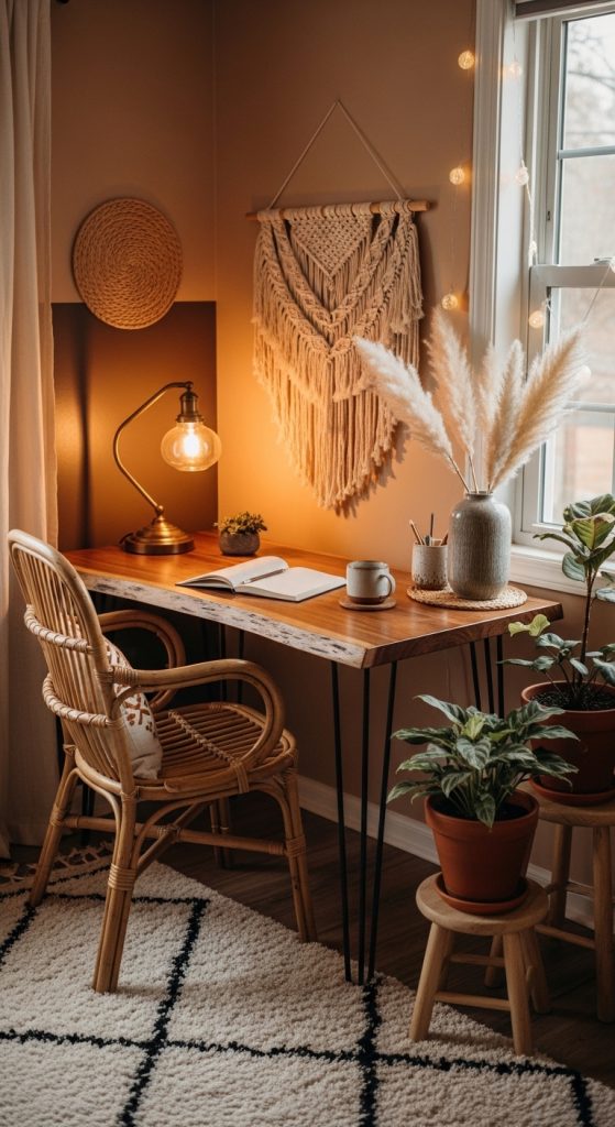 This idea uses earthy tones, woven textures, and plants. A wooden desk with rattan décor creates a warm and artistic vibe.