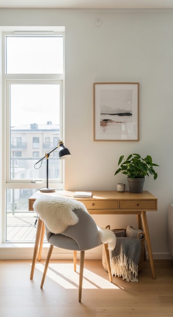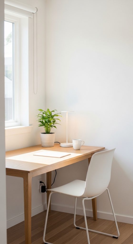 Use a simple wooden or white desk and keep décor minimal to avoid blocking light. Add a small plant or lamp for evening use.