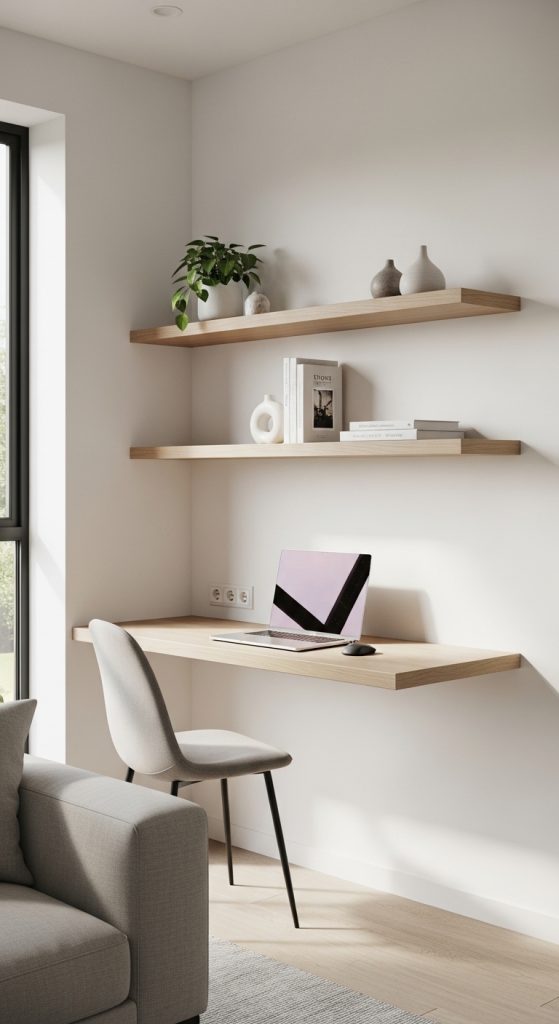 A floating desk is perfect for small living rooms. It saves floor space and creates a clean, modern look.