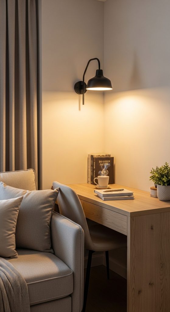 Next, select a compact desk that fits the available space. Wall-mounted or floating desks are ideal for small areas, while corner desks work well in slightly larger rooms.