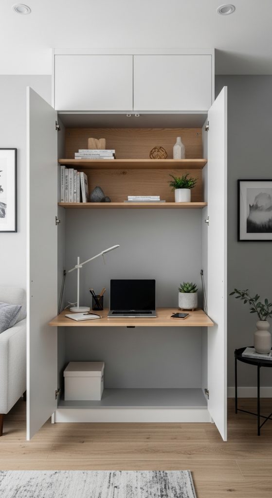 A hidden study nook can be created inside a cabinet or foldable desk system. When not in use, it can be closed to maintain a clean living room.