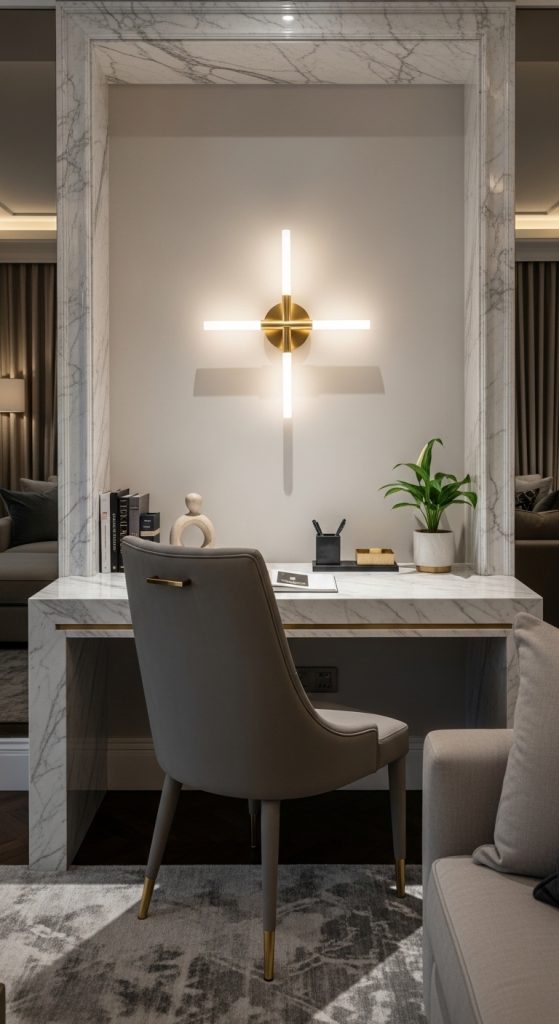 A marble-top desk with gold accents creates a luxurious workspace inside your living room.
