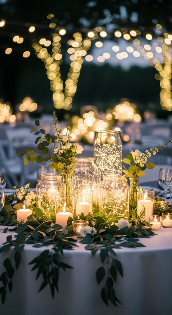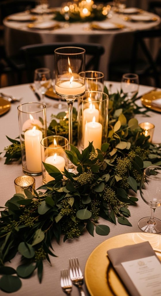 Candles paired with greenery create a romantic and cozy atmosphere for wedding receptions.