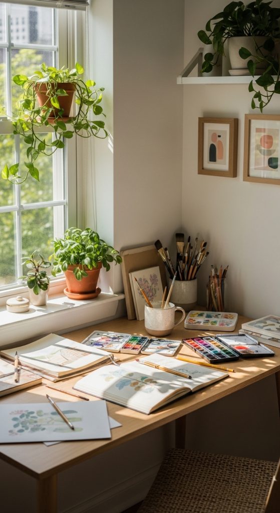 Pinterest trends show a growing love for minimal yet aesthetic art corners — spaces filled with natural light, clean storage solutions, and personal touches like plants, inspiration boards, and color palettes. These setups prove that creativity isn’t about square footage; it’s about atmosphere and functionality. A tiny studio can feel inspiring, calming, and uniquely yours.
