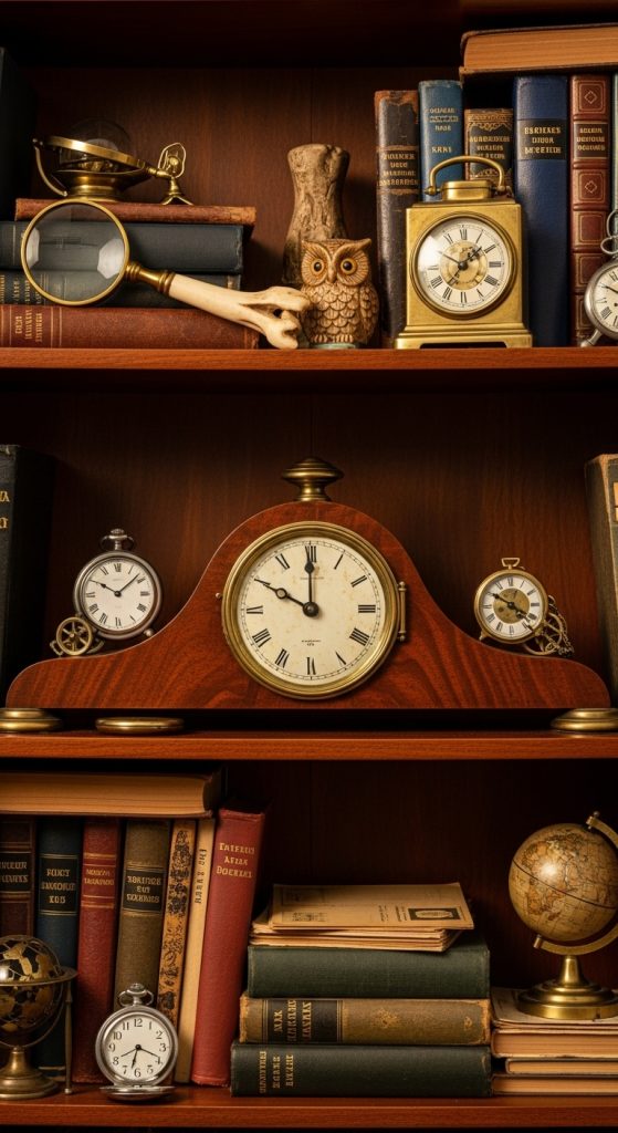 Vintage clocks symbolize history and timelessness, making them perfect for bookshelf decor. They add a focal point without overwhelming the shelf.