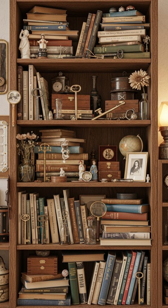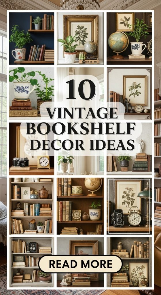 This article is written in a professional Pinterest blog style, focusing on practical, achievable, and save-worthy vintage bookshelf decor ideas. Each idea includes a clear explanation, step-by-step guidance, and a list of elements you can use to recreate the look in your own home — whether you’re styling a full wall of shelves or just one bookcase.