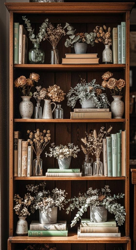 Plants soften vintage shelves and prevent them from feeling heavy. Dried botanicals or muted greenery work best for a classic look.