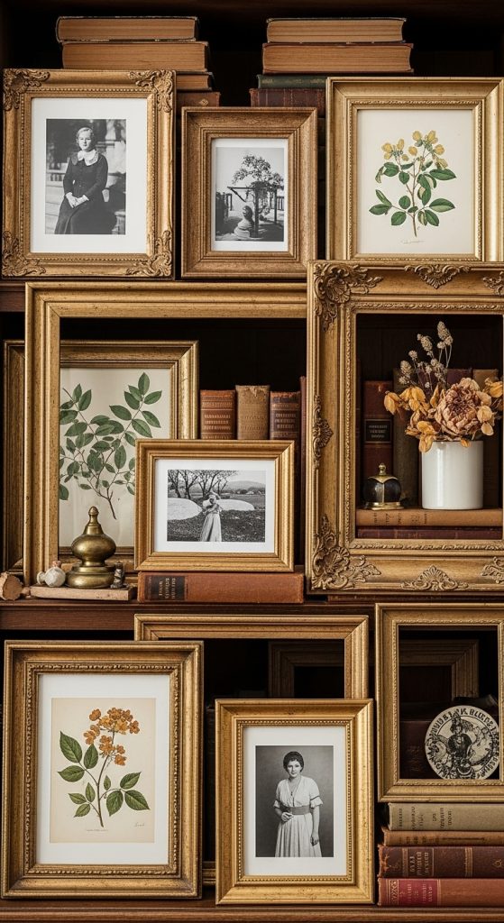 Old frames add depth and personality, even when placed directly on shelves instead of walls. Black-and-white photos, botanical prints, or old artwork enhance the vintage feel.
