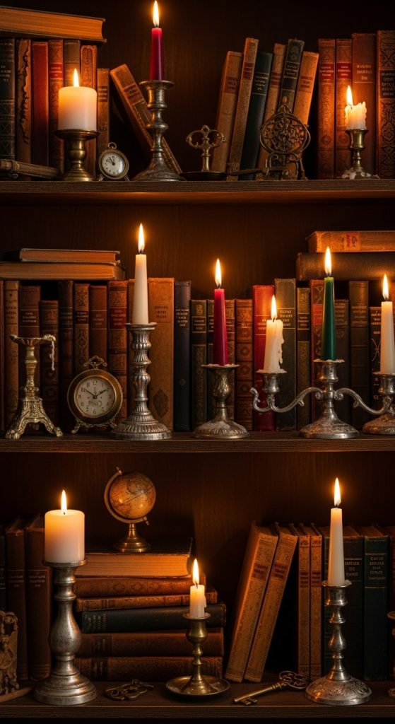 Place candles near books but safely spaced. Use varying heights for interest. Consider flameless candles for practicality.