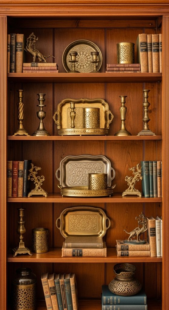 Brass and aged gold accents bring warmth and elegance to vintage bookshelf decor. Think candle holders, small trays, frames, or figurines with a soft patina rather than shiny finishes.