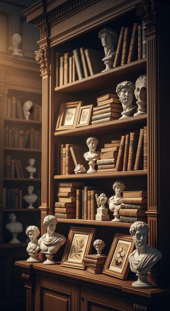 Small sculptures or classical busts instantly elevate shelves and create an intellectual, old-library feel.