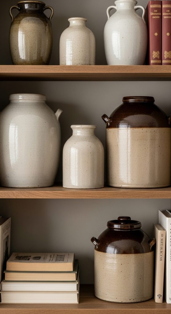Stoneware crocks, ceramic pitchers, and vases bring texture and an old-world charm to bookshelves. Their matte, imperfect surfaces contrast beautifully with books.