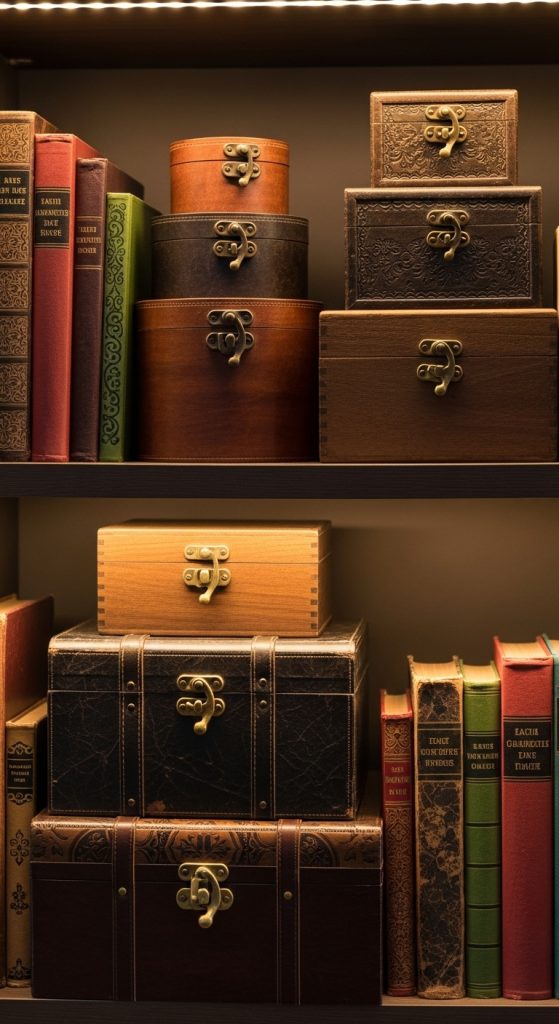 Vintage-style boxes add structure and function. They’re perfect for hiding small items while contributing to the decor.
