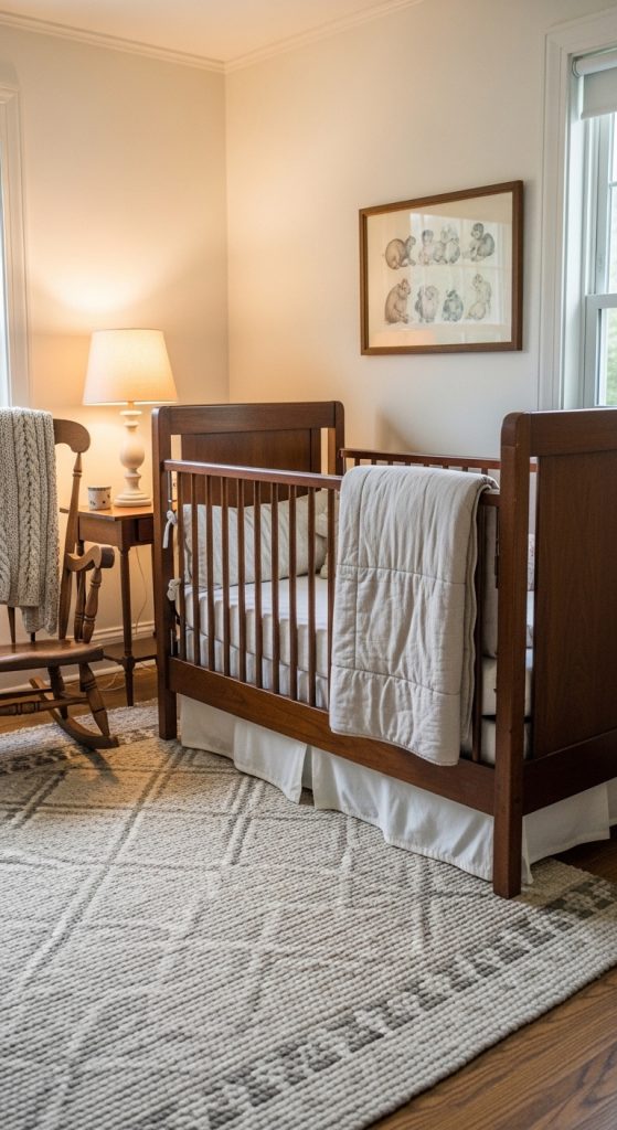 This nursery style features antique or vintage-inspired wooden cribs, rocking chairs, and dressers. The rich textures of wood create a warm environment that feels both rustic and elegant.